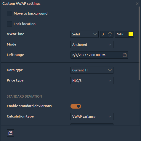 Specify the start point on the chart and anchored VWAP will draw a line to the current moment. Also, you can specify the endpoint for the line, set Standard Deviation and Maximum Permissible Deviation.