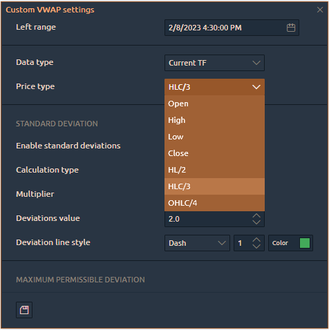 Standard Deviation Bands. When the parameter is active, the standard deviation lines up and down from VWAP will be additionally calculated on the chart. Specify the number of standard deviations in the "Value" field and colors
