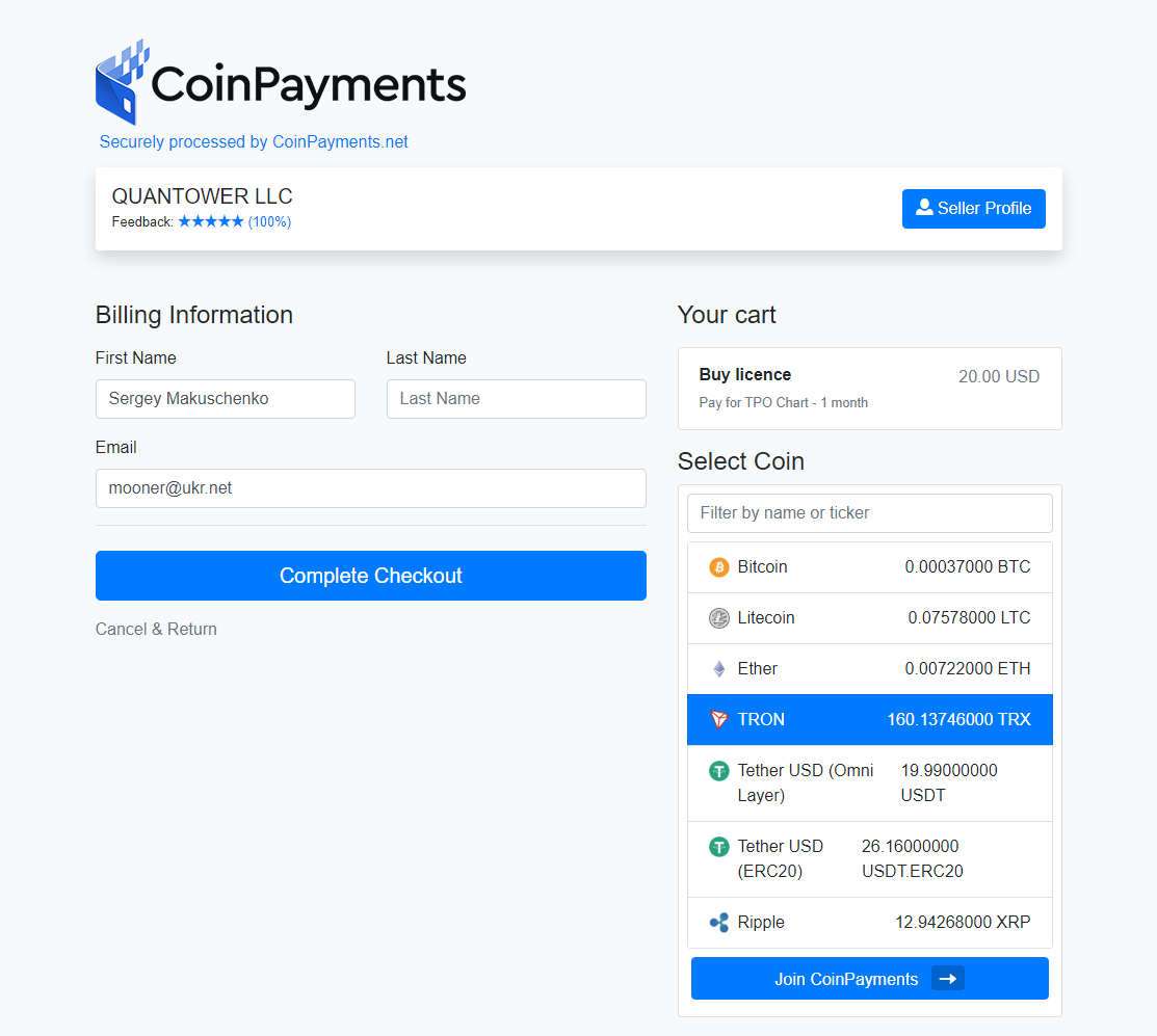 When you decide to pay for a license using your crypto-assets, you should press “Buy” for the required feature. Next, you should click “Pay with Coinpayments”. Now, you will be redirected to Coinpayments merchant where you should select a coin and then — “Complete Checkout”. You can register here, but it is not necessary.