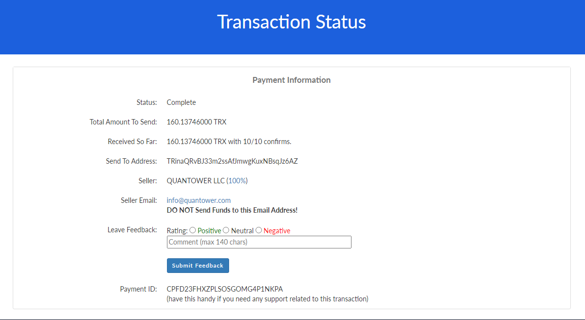 - Payment ID. Copy & save it somewhere, in case some technical fail (your PC turns off and you won’t reach this page). This ID is needed to contact Coinpayments for further transaction support.