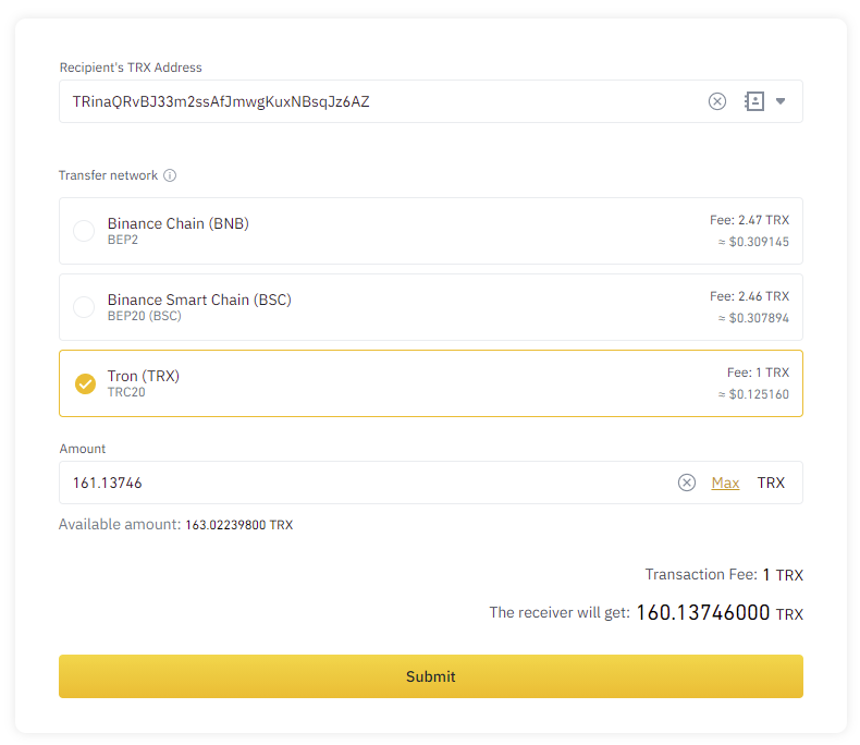 Now you need to make a transfer of the selected coins from your wallet. This process depends on where you are sending from. As an example, you can see how Binance informs about commissions and receiving amounts after transfer: