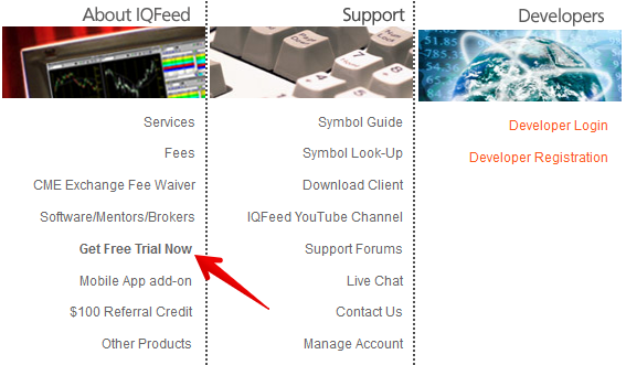Go to IQFeed official website and follow ‘Get Free Trial Now’ link in the About IQFeed section. In the opened window select the first offered option (DTN IQFeed) and click on the Continue to DTN Registration Site button.