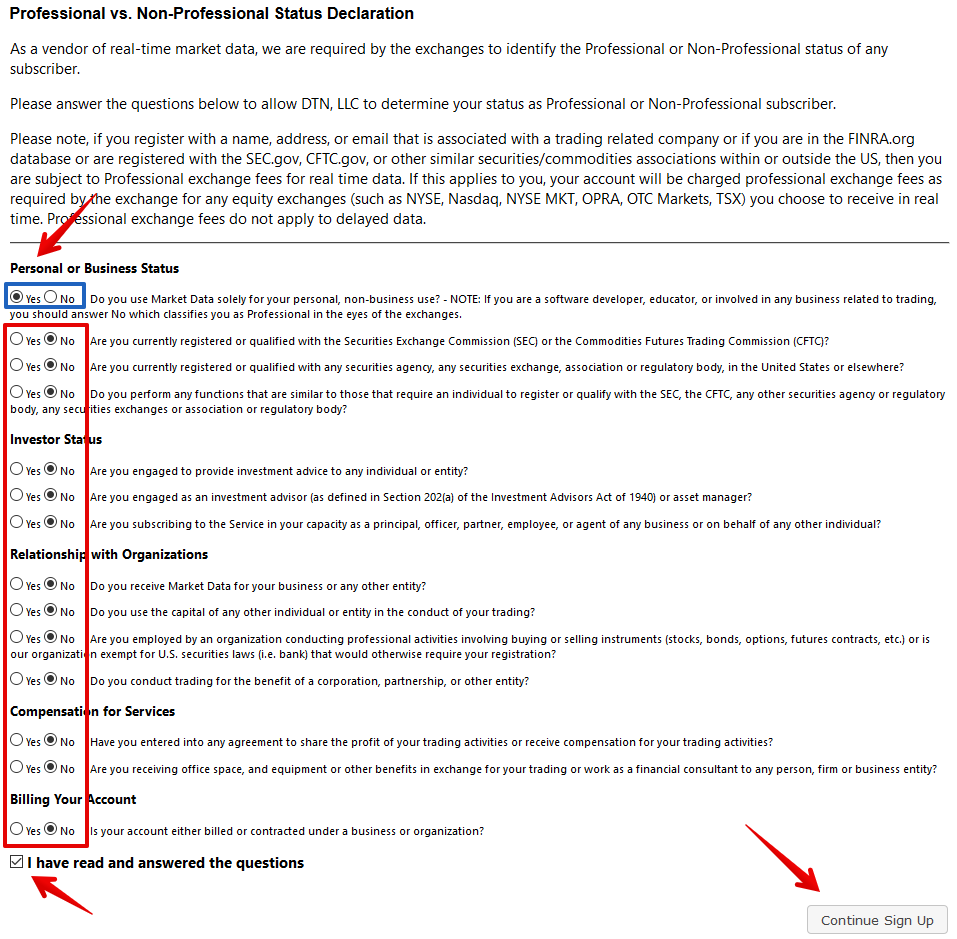 - Once you click Continue to DTN Registration Site button, the following window will apper in which you need to tick off the items as it is shown on the picture below, place a check mark in the I have read and answered the questions case and Continue Sign Up: