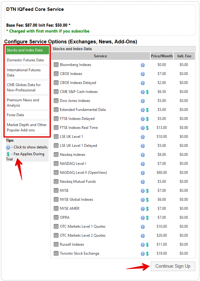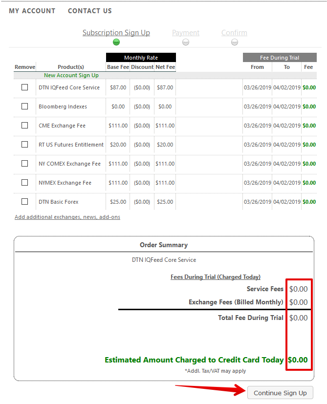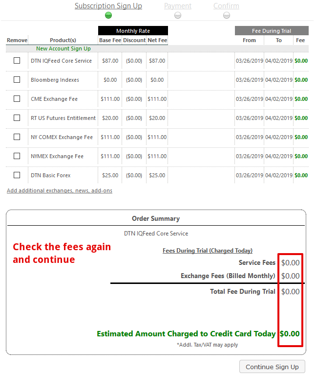- Check the amount stated in the Fee section of the following window. In case you wish to get IQFeed data completely free during trial period, your total amount to pay should equal $0.00. Check it and Continue Sign Up