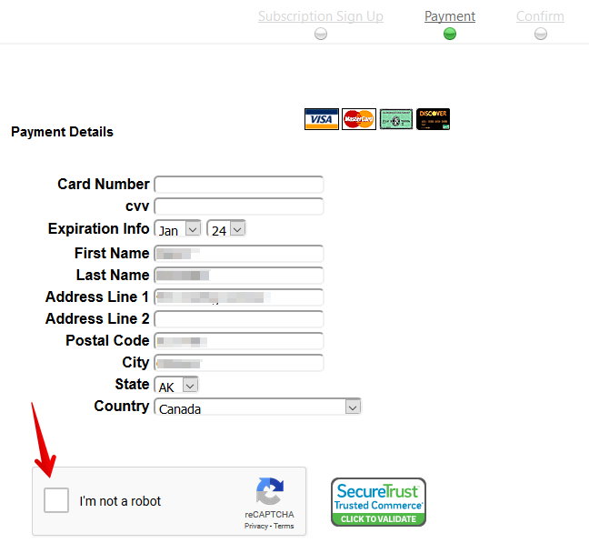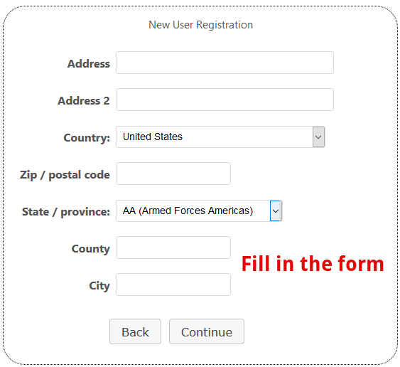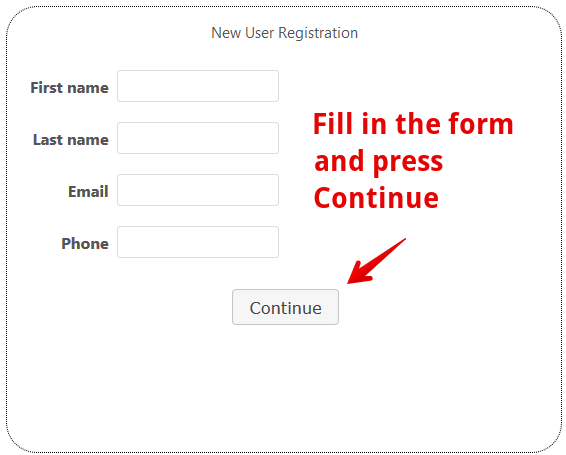 - In the respective fields of the following opened windows enter your personal information and click Continue: