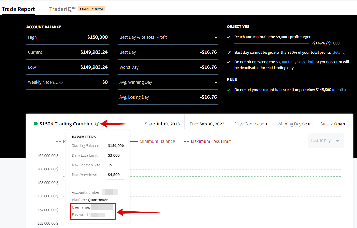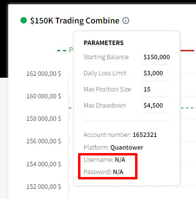 To access a trading account through the Quantower platform, you need to click on the icon for additional account information. Your login and password details will be displayed there.