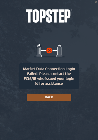 Market Data Connection Login Failed. Please contact the FCM/IB who issued your login id for assistance.