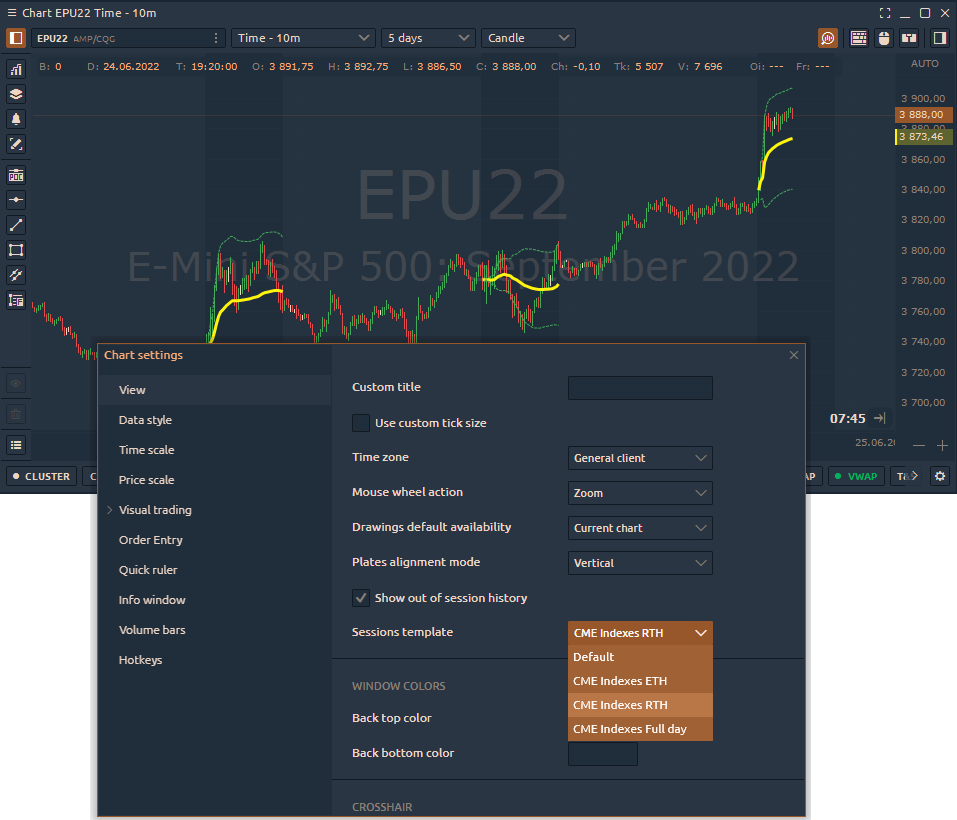 Sometimes, you may want to display data on the chart only for RTH (Regular Trading Hours) or ETH (Extended Trading Hours) session and hide all data that falls outside the specified session time. To do this, open the chart settings, go to the View section, and uncheck the "Show out of session history" option. This way, you'll see only the data relevant to the selected session.