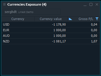 Currencies Exposure panel shows a summary currency information for all positions, opened on Forex instruments. Currencies Exposure panel is related to Informational group of Control Center sidebar.