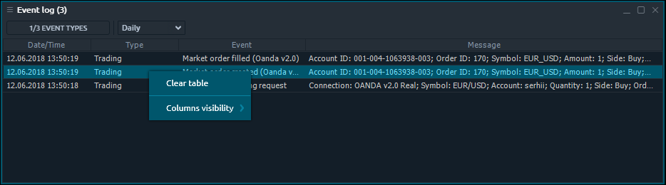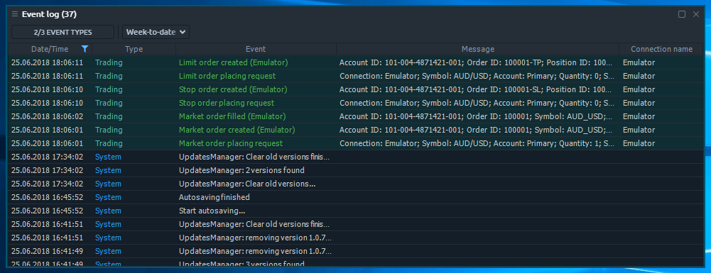 Event Log panel displays detail information about all events that occurred during working with the trading platform. Event Log panel is related to Informational group of Control Center sidebar. if any error occurs, it will be logged here. You can see such important information about the platform here and pass it on to our technical support if necessary.