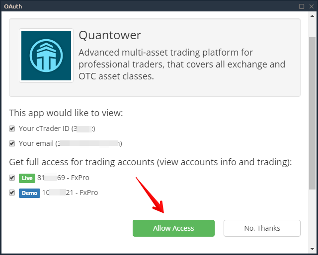 - Before connecting for the first time through Quantower platform, you need to activate your account in the cTrader system. You can do it via FxPro cTrader Web-based platform https://ct.fxpro.com/