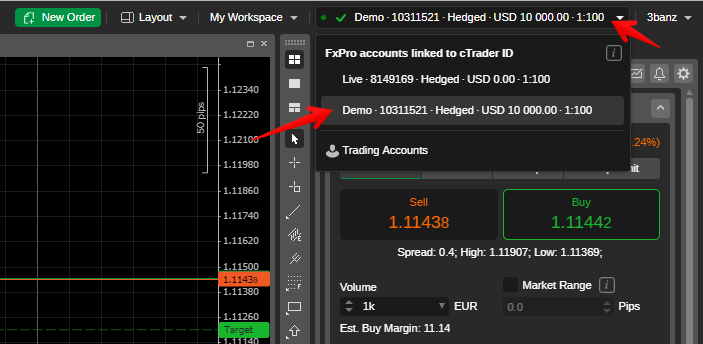 - Once you logged in to the cTrader web terminal, accept the agreement and switch to the demo account in the upper right corner of the web terminal. This is necessary to activate both the Real and Demo accounts separately.