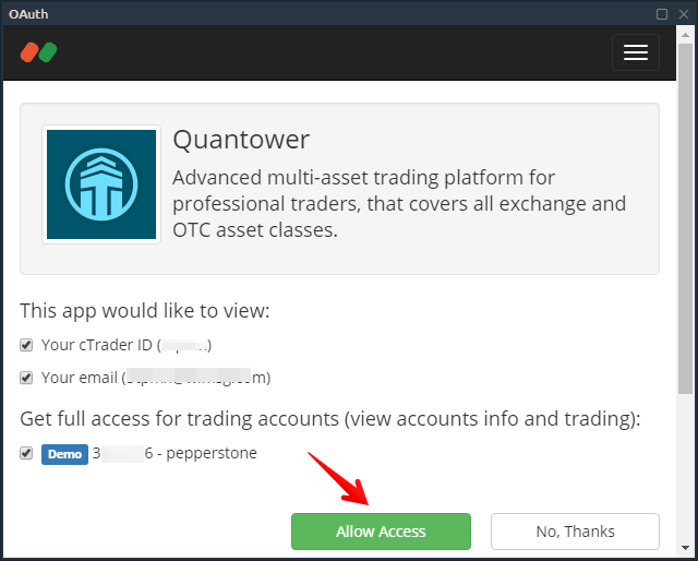 - After that, in the Quantower platform in the connection manager, select cTrader Gateway connection with Demo or Real and press "Connect" button. An authorization form will appear, where you need to specify an email or cTrader ID, as well as a password. This is a standard OAUTH authorization where you can see the connection information. Allow access and start trading 🙂
