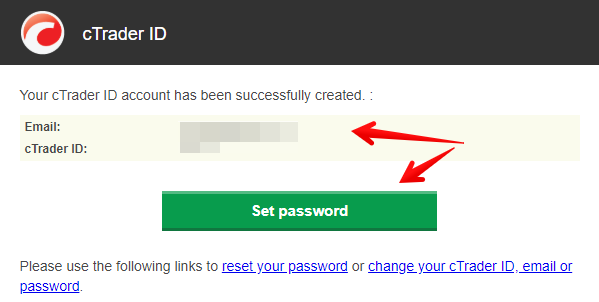- After creating a demo account, check the E-Mail that you used when registering your account. In the letter with subject "Welcome to cTrader ID" is your ID that will be used as a login in platforms Quantower and cTrader. Set the password for authorization by clicking on the "Set Password" button.