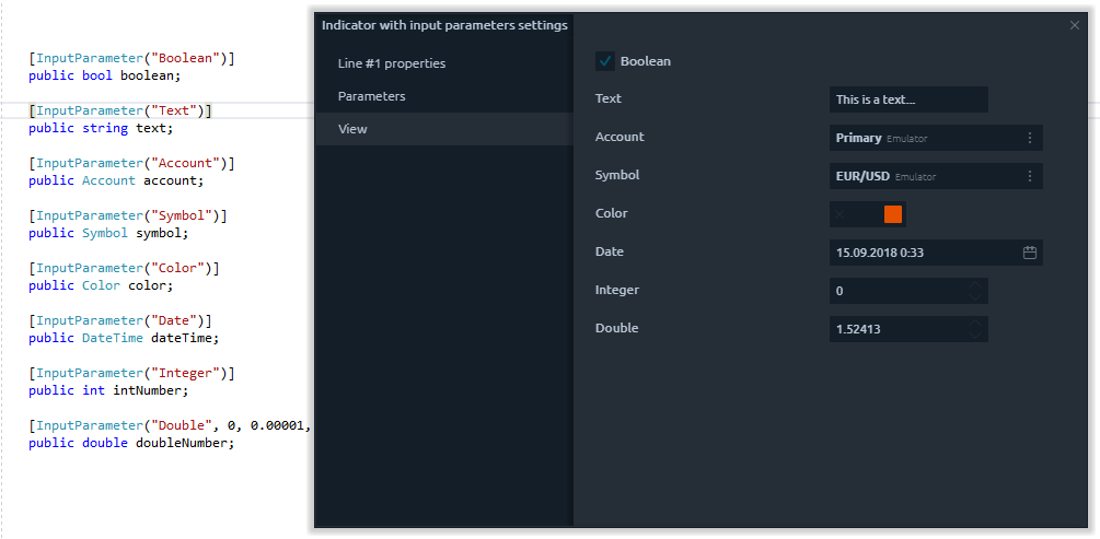 From a technical point of view, Input Parameter is a usual variable marked with a special attribute. At the moment we support main basic types: string, number, date time, account, symbol, a list of options and others.