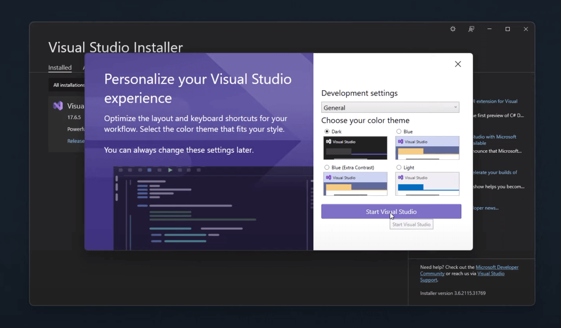 Continue installation and in a few minutes, after downloading and applying required packages, Visual Studio will start automatically: