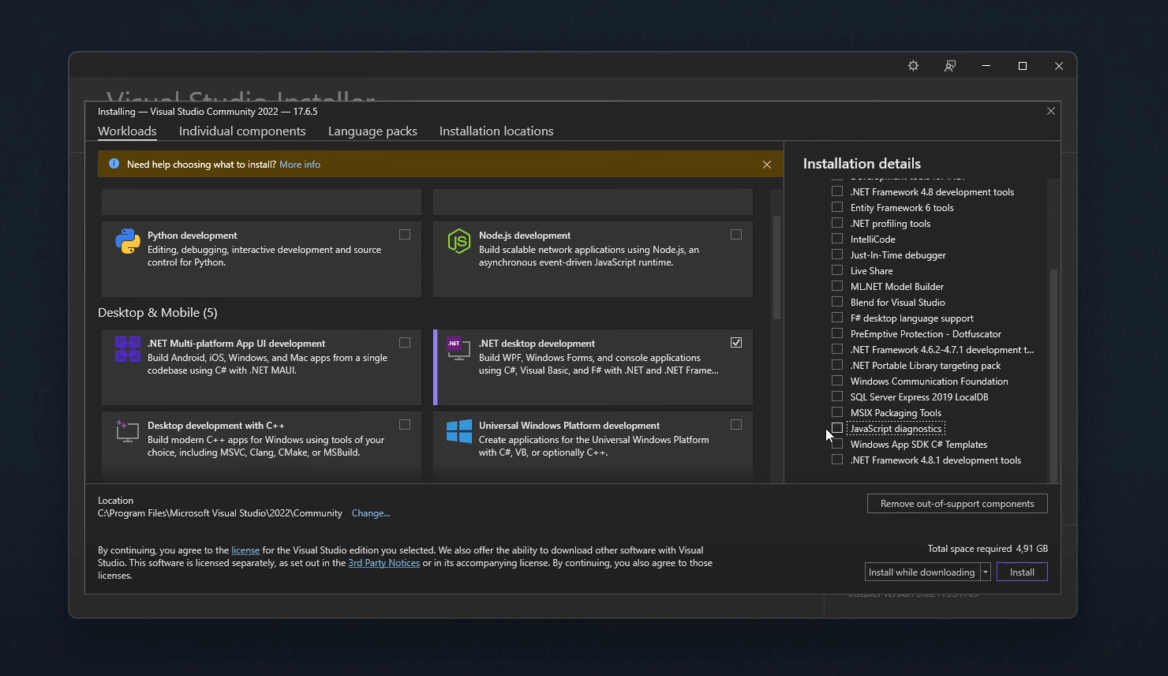 Download the web installer and run it. After initialization, you will be prompted to select the required components. For using with Quantower Algo extension we need only the "NET desktop development" workload. You can uncheck optional components also, to reduce installation size: