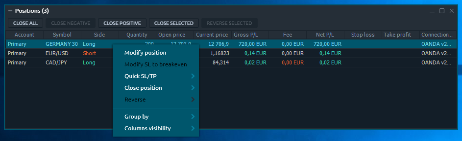 By right-clicking on each row of Positions panel, you will get a context menu with the following functions:
