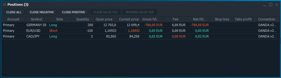 Positions panel displays an extended information about all currently opened positions, their P/L and prices