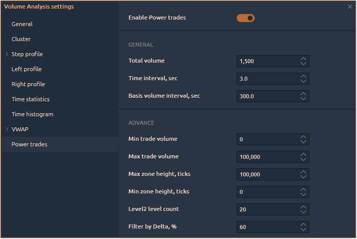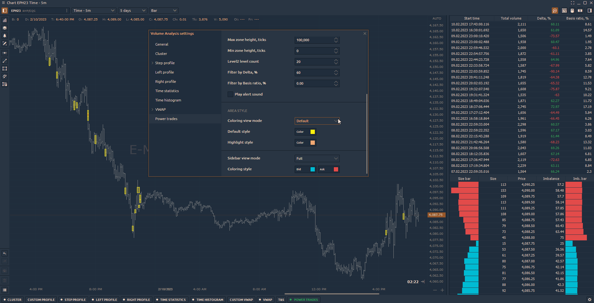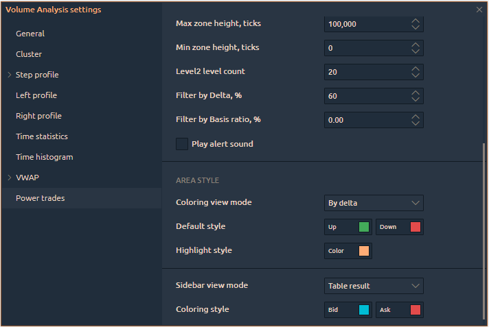 Coloring view mode — set the color for all found areas on the chart. By delta mode: colors can be set depending on the sign of the delta - positive or negative. By filtered volume: mode sets a different color for areas whose total volume is greater than or equal to the one set in the threshold.