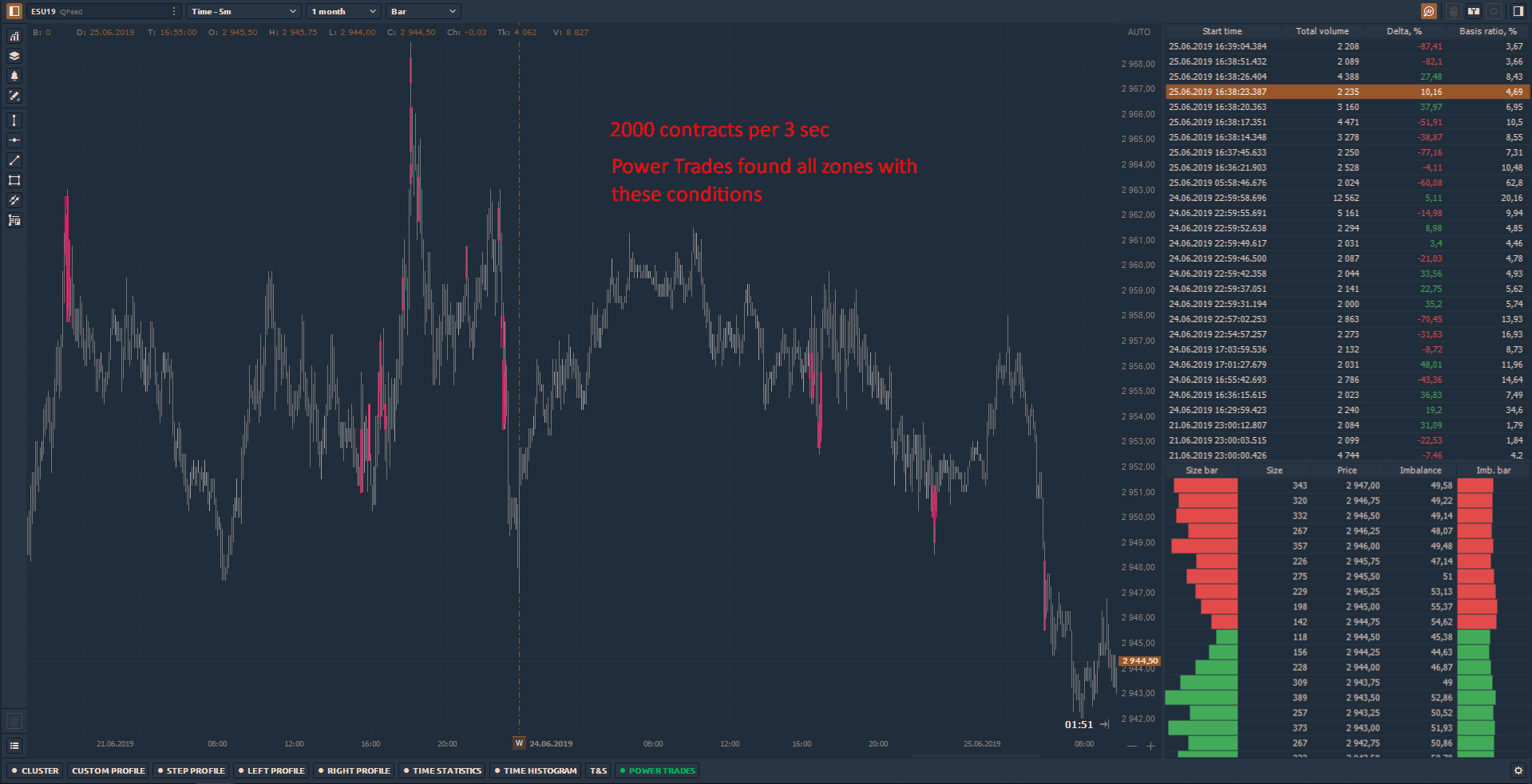 For example, let's set the Total Volume of 2'000 contracts and Time Interval in 3 seconds on the E-mini SP500 futures. This means that the scan will be based on the available history and will show on the chart only those zones that have such a volume for the specified time.