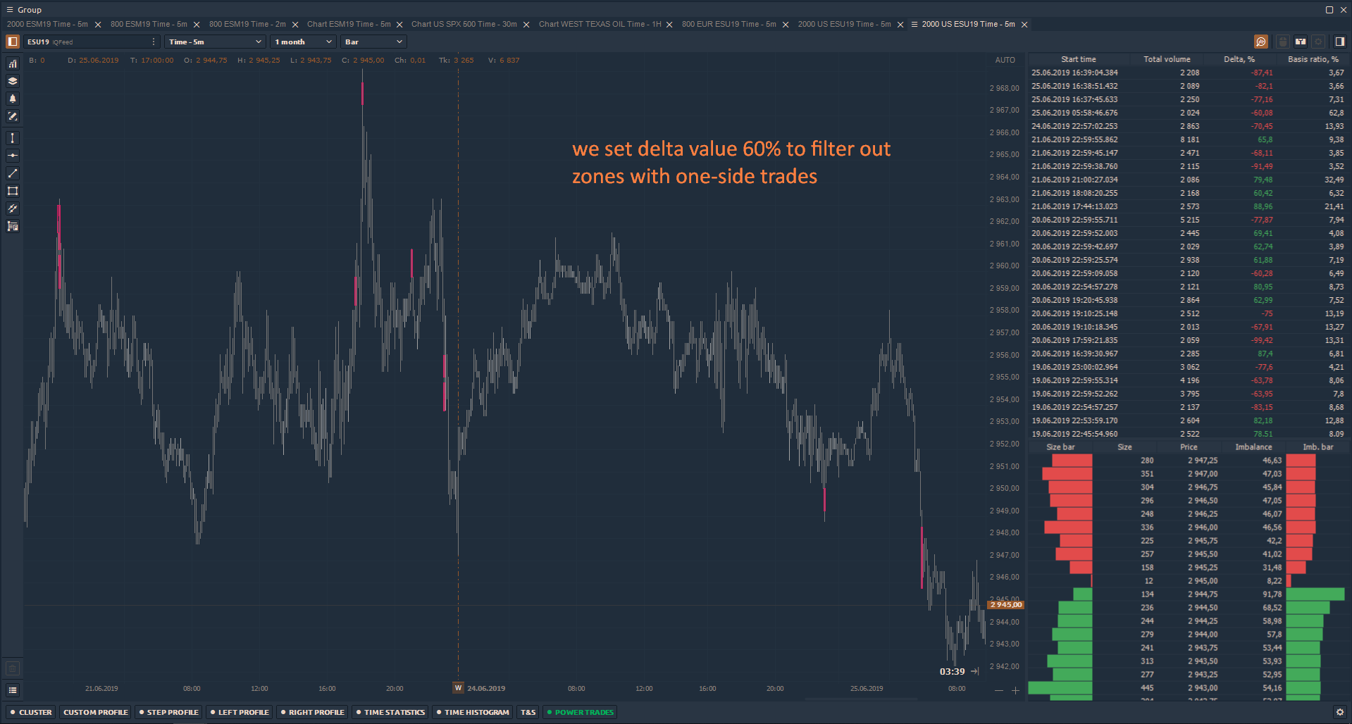 Additionally, it is worth to set a delta value to filter out the zones with one-side trades. The more delta value, the high probability that the price will reverse.