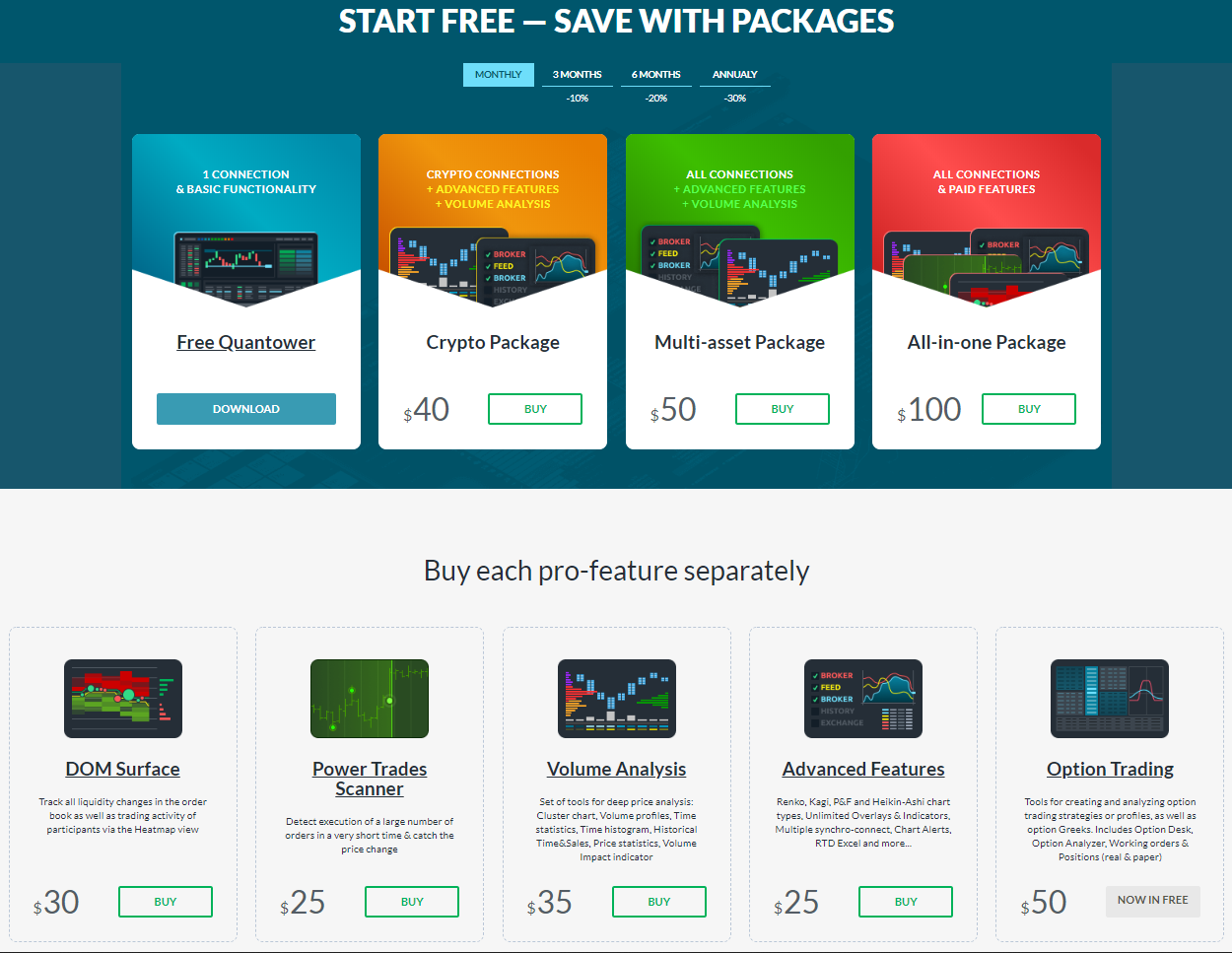 Multi-Asset Package includes all options that are available in the Crypto Package, plus gives access to Forex, Futures, Stock brokers and other data feeds.