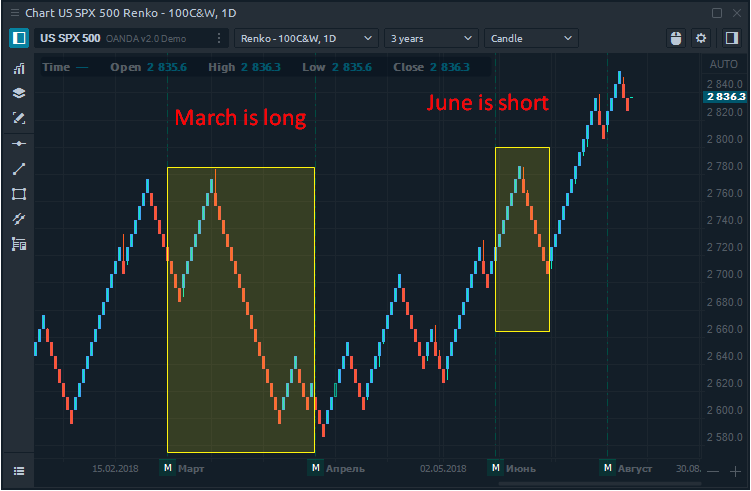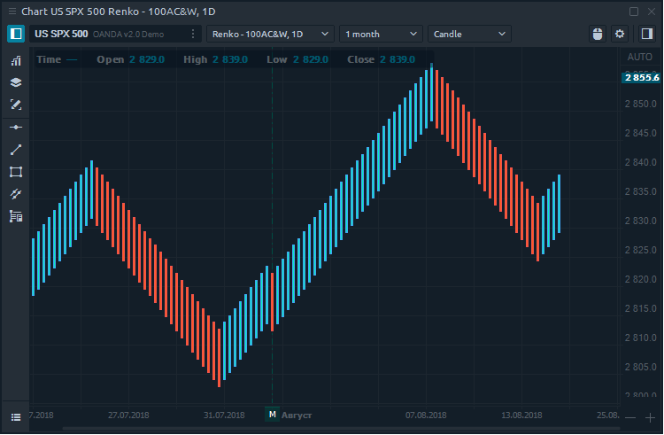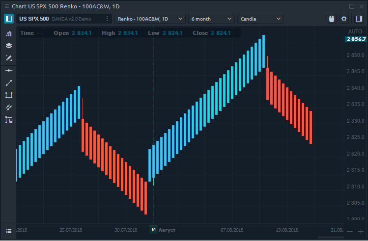 Renko chart is completely time-independent, based on price movement only and help filter out the noise that can occur on other chart types. Renko is built from bricks, which are created only when the price exceeds the body of the previous brick by a certain size, which is set by the trader in the chart parameters.