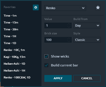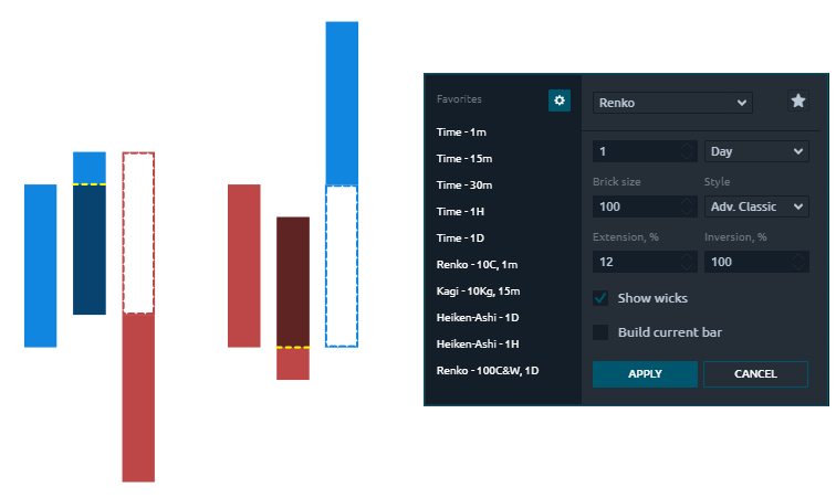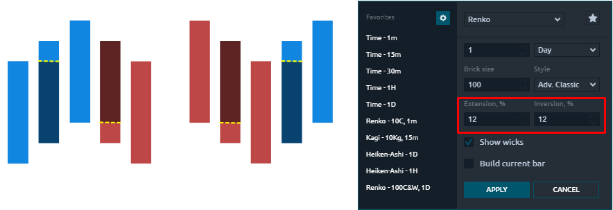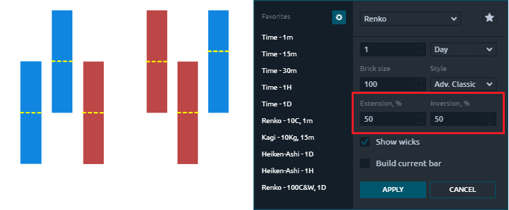 Show wicks — allows you to add wicks to Renko bricks, indicating actual highs and lows within a brick.