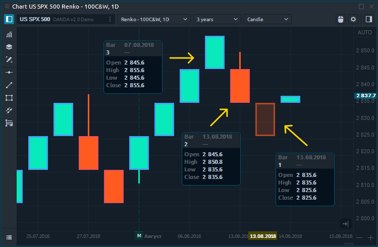 The construction of the Renko chart is based on bricks, the size of which is set up by the trader. Thanks to this, the Renko chart ignores the time and focuses on price changes only. For example, by setting Brick size 10 points, the new brick will be built when the price is reaching out 10 or more points. Otherwise, the price of the Renko chart will not change.