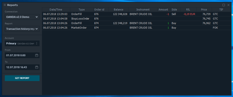 The Reports panel was created to allow traders to get the various statistical information from their broker. The list of available reports vary depending on the broker. Some connections doesn’t provide reports at all.