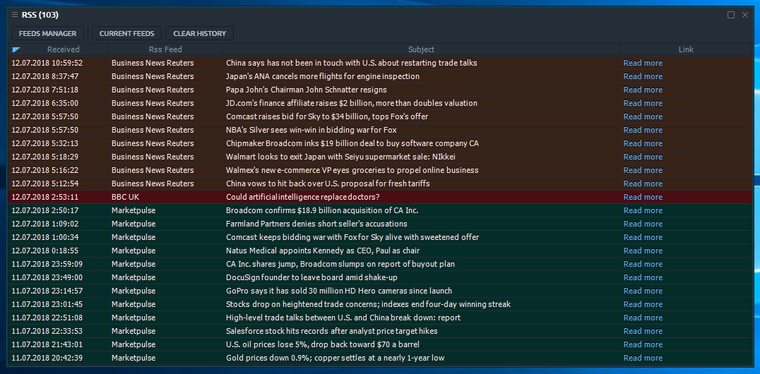 RSS (News panel) was developed in order to allow traders to watch the news feeds right inside the Quantower platform.