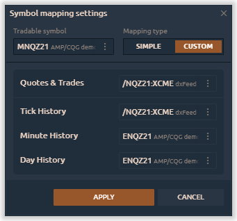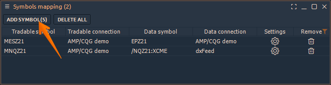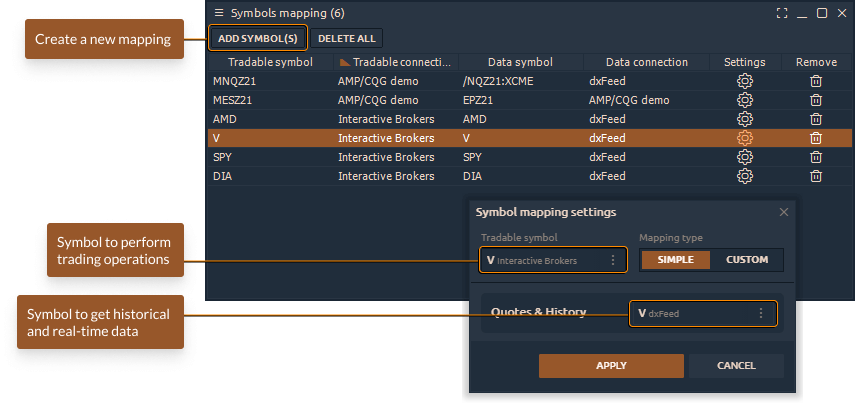 The panel is a table where the trader adds symbols for trading, and also selects from which connection and which symbol to receive quotes for analysis. After creating a mapping, the trader must open the chart of the symbol that he will trade (for example, from Interactive Brokers connection). In this case, all data for this symbol will come from the second connection (for example from IQFeed or from dxFeed).