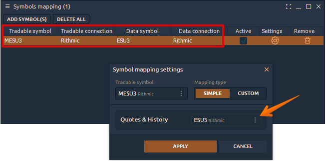 How to create a mapping between Mini and Micro symbols (ES and MES) on the same connection (Rithmic or CQG only)?