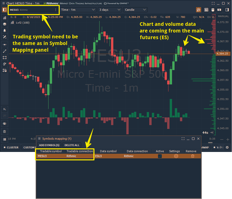 - Open the chart of the symbol on which you intend to perform trading operations. In this example, you need to open MESU3. Historical and real-time data will be transmitted from the main ESU3 futures (as configured in the mapping panel). This setup enables you to analyze volume-related data (profiles, clusters, power trades) from the ES futures while executing trading operations on the MES micro contract.