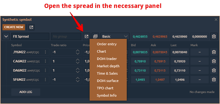 When you open a position for a selected synthetic spread, the platform will open positions for each instrument that are included in this spread. The size and the side of the position corresponding to the set values in the "Trade Ratio" field.