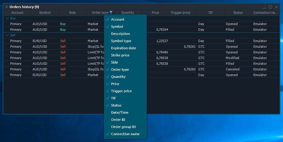 Other useful features of column management are sorting and resize. Each column can be dragged by its header between other columns inside the table in order to set the required sequence. You can also drag the vertical borders between two columns to resize them.