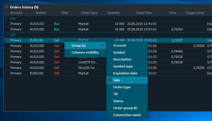 To apply the grouping just right-click on the table body and find an option “Group by”; the second-level of context menu will contain all of available columns that can be grouped by. You can group by one column only. To cancel grouping — follow the previous steps and uncheck the column.