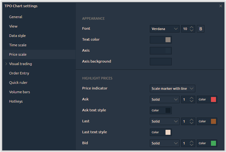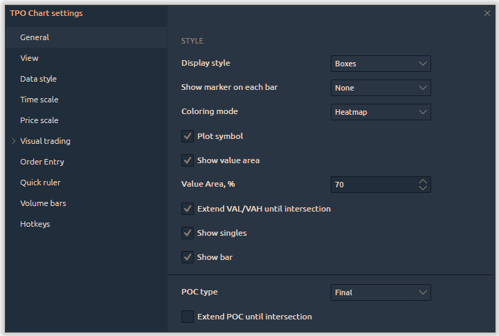 - Plot Symbol — show/ hide the standard chart on the TPO Profile chart. Select a chart style: Bar, Candle, Line, Area, Dotted Line, Quantower style.