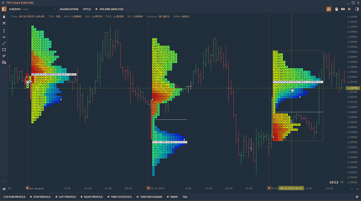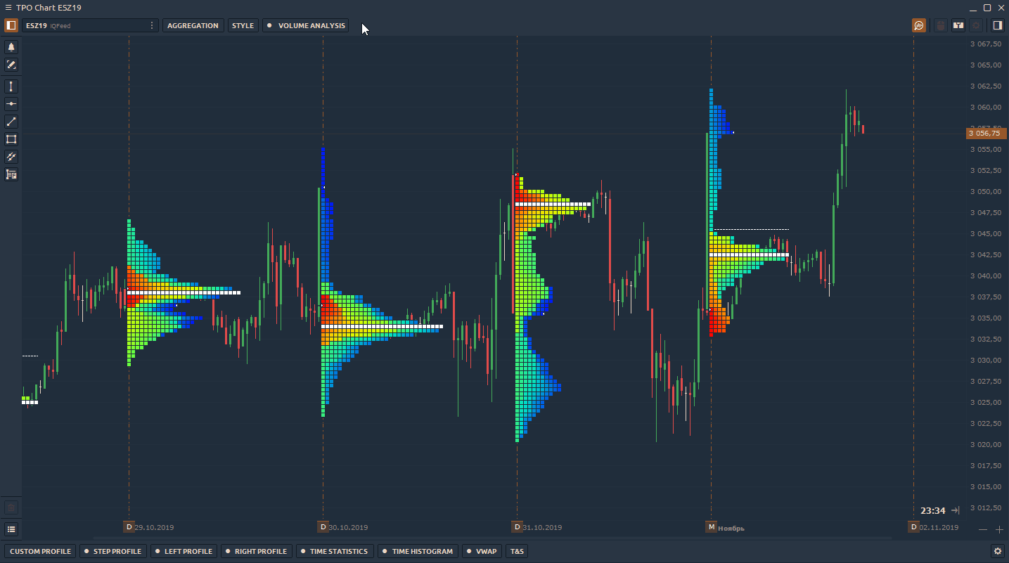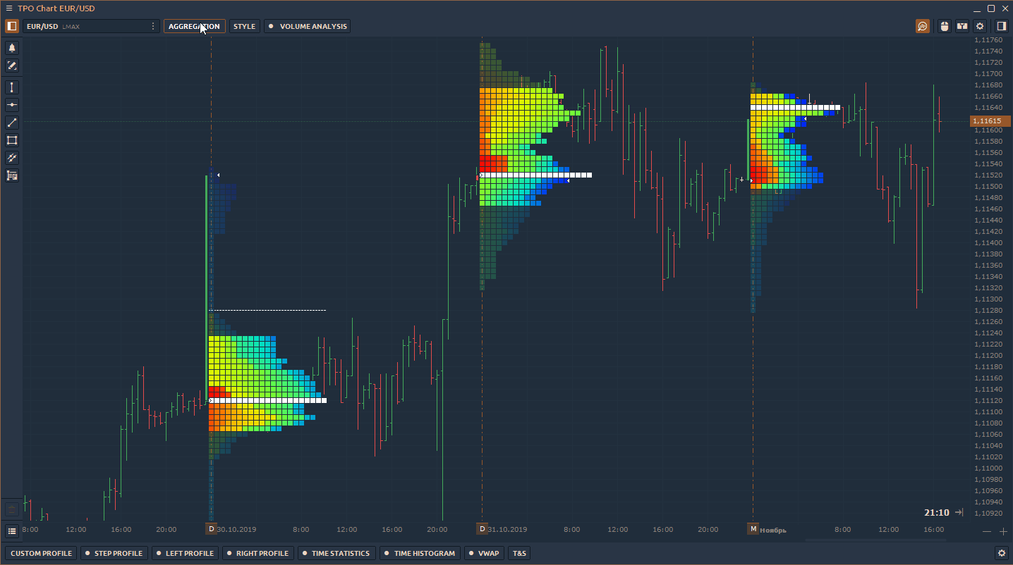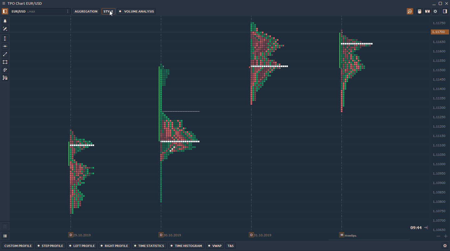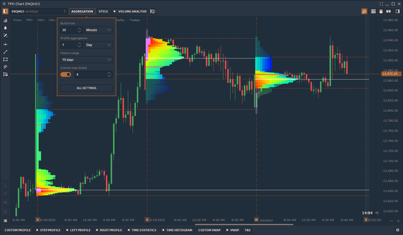 Profile Aggregation — defines the range for each TPO profile. The standard range is 1 day, but there are several base ranges for building each profile — Minute, Hour, Day. For example, a 1-day range will start at the beginning of the trading day and finish at the end of the current trading day (defined in the trading hours or by custom session).