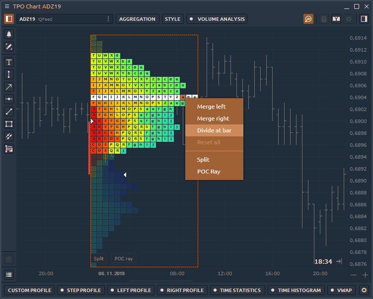 Divide by bar, that option splits the profile in half on the selected bar. To separate TPO profile in half, select a necessary profile and right-click to open the context menu and click on "Divide by bar" button.