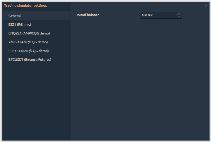 In the general settings, you can set the initial balance for the test account, set the delay in execution, and configure the settings of netting for each instrument.