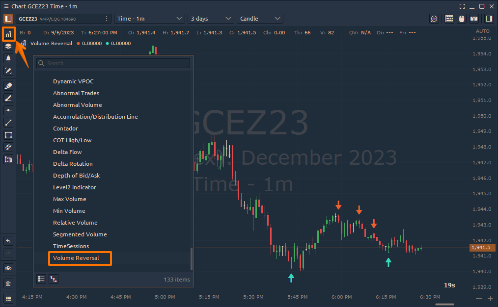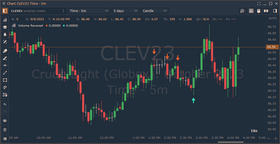 The Volume Reversal indicator scans for a specific chart pattern spanning three bars. It identifies a scenario where there are two bars with increasing volume in one direction, followed by the third bar moving in the opposite direction with higher volume. This signal is a strong indicator of an impending price move in the direction of the third bar.