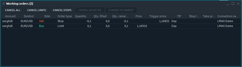 Once you places a new order, it appears in this panel and becomes available to be managed. Working orders panel is related to Portfolio group of Control Center sidebar.